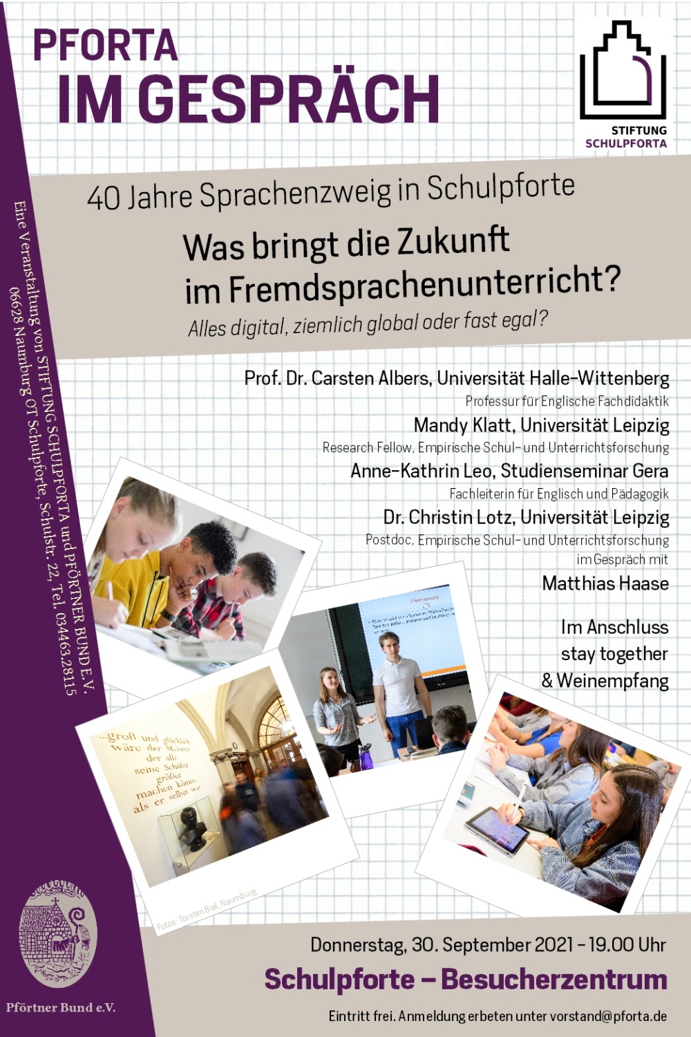 Die Landesschule Pforta feiert das 40-jährige Bestehen des Sprachenzweiges. Dazu veranstalten die Stiftung Schulpforta und der Pförtner Bund e.V. eine Podiumsdiskussion mit Gästen aus Wissenschaft und Schulwesen. Statt Rückschau zu halten wird Matthias Haase mit Gästen von der Universität Halle-Wittenberg, dem Studienseminar Gera und weiteren über die Zukunft des Fremdsprachenunterrichts diskutieren.
